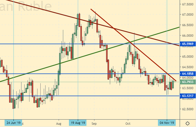 Рубль остается стабильным, продолжая находиться выше сильного уровня поддержки 63.50. Все готово к новогоднему ослаблению. Тем более, что ЦБ РФ не скрывает своих намерений при отсутствии инфляционного давления снижать ставку и дальше. В преддверии IPO Saudi Aramco мы не ждем низких цен на нефть, правительство Саудовской Аравии этого просто не допустит. Возможно, что и США возьмут на себя часть союзнических обязательств и не станут раскачивать лодку, обеспечив режим наибольшего благоприятствования. Поэтому, масштаб ослабления национальной валюты не будет носить характер бедствия. Достижение отметки 65.00 выглядит реальным. Отметка 70.00 — возможна.