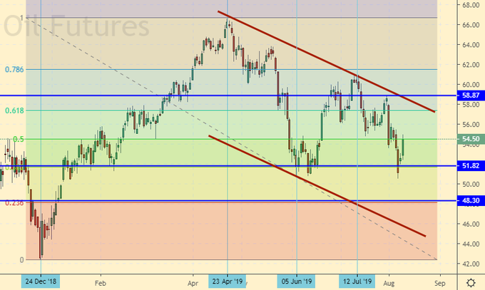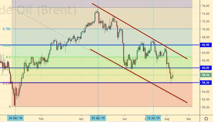 Сценарий роста: рассматриваем октябрьский фьючерс, дата экспирации 30 августа. Выше 60.00 рынок вряд ли вырастет. Пока не покупаем. Учитывая то, как рынок нефти умеет разряжаться, даже при падении к 50.00 дно (точку разворота вверх) мы искать не будем.