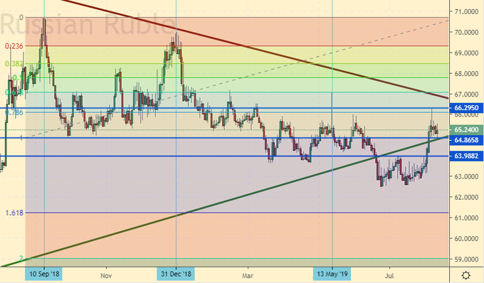 Сценарий падения: если рубль вернется под 64.80, а еще лучше под 64.00, картинка вновь станет по доллару медвежьей. Рубль будет укрепляться при условии, что цены на нефть не преподнесут неприятный сюрприз. Откат от 66.30 выглядит интересно.