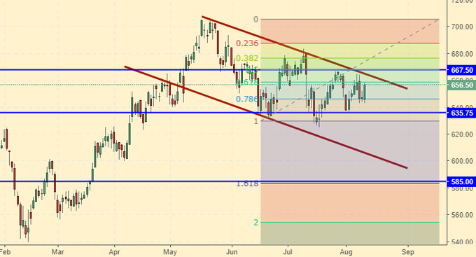 Сценарий роста: рассматриваем сентябрьский фьючерс, дата экспирации 12 сентября. Как видим, падение среды почти полностью нивелировано, хотя шансов на развитие падающего тренда пока куда больше, чем на разворот вверх. Пока рынок находится ниже района 670.00 – 680.00 входить в лонг смысла нет.