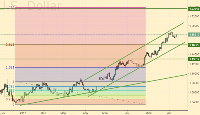 Сценарий роста: ЕВРО продолжает держаться выше 1.1800, что несколько удивительно. Но ничего. Быстрее на 1.2370 окажемся. Однако, учитывая потенциально возможный коррекционный ход на 1.1600 из текущей конструкции, подтянем стоп-ордер на 1.1790. Так намного спокойнее. Кстати, при касании 1.1600 можно купить снова.