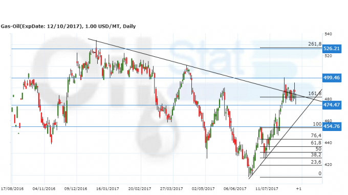 Сценарий роста: рассматриваем октябрьский фьючерс с датой экспирации 12 октября. Gasoil двумя неделями ранее агрессивно проделал большой путь наверх, теперь стоит в нерешительности, так как нефть не торопится подниматься выше. Отсюда еще возможен спуск к 455.00 перед новой фазой роста к 530.00 и им надо воспользоваться. Ничего более интересного здесь нет.