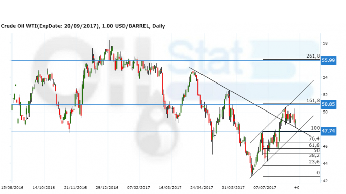 Сценарий роста: рассматриваем октябрьский фьючерс с датой экспирации 20 сентября. Покупатели четырехнедельной давности продолжают ждать и надеяться на продолжение роста. Остальные ждут отката к 47.85. Стоп: 47.64. Нужно учитывать, что если рынок возьмет 50.90, то откроется отметка 56.00 и рост продолжится.