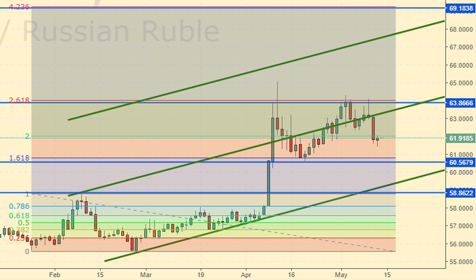 Сценарий падения: нижняя граница восходящего канала как раз проходит на 60.00. Падение ниже приведет к параличу сознания ряда трейдеров, но мы не будем впадать в обездвиженное состояние: «да как же так», и уже сейчас напишем, что в случае продолжения драки США-Европа-Иран-Китай-Турция-Израиль-Сирия мы можем и подняться, то есть спуститься к 50.00. И еще… не граждане РФ: Лукашенко, Порошенко и Назарбаев начинают в своих палатах тренироваться вставать на колени, просить прощения и каяться за грехи последних 10 лет.  И в этой фразе нет никакой политики, только экономика. В случае продолжения мирового бардака ждем притока инвестиций в Россию.