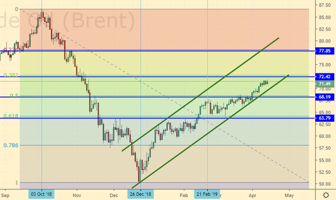 Сценарий роста: рассматриваем июньский фьючерс, дата экспирации 30 апреля. Продолжаем считать, что до 72.50 мы дойдем. А вот подъем к 78.00 может быть проблематичным. В первом квартале запасы нефти в мире сокращались благодаря снижению добычи экспортерами. Но как долго страны ОПЕК будут смотреть на рост сланцевой добычи в США?
