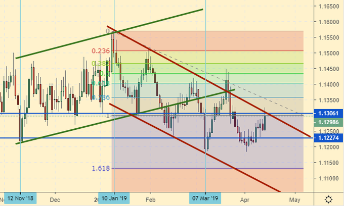 Сценарий роста: откатили к 1.1300. И даже протолкнули тень выше… Хм-хм… Поступило предложение не рассматривать рост пока мы ниже 1.1350. Для продаж место хорошее, а для покупок эта картинка пока выглядит недостаточно убедительно.