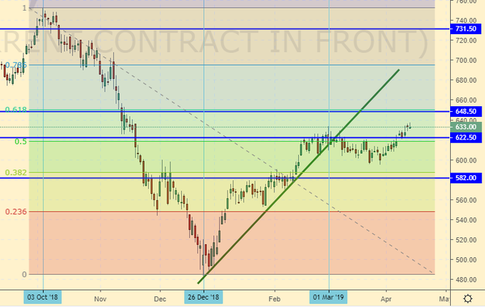 Сценарий роста: рассматриваем майский фьючерс, дата экспирации 10 мая. Нет длинных свечей с красным и зеленым телом. Никто ни в чем не уверен, но мы как-то продолжаем восхождение. До 648.50 должны дойти. Рост выше не очевиден. Кто в покупке от 630.0 – набирается терпения и не забывает двигать стоп-ордера по тренду.