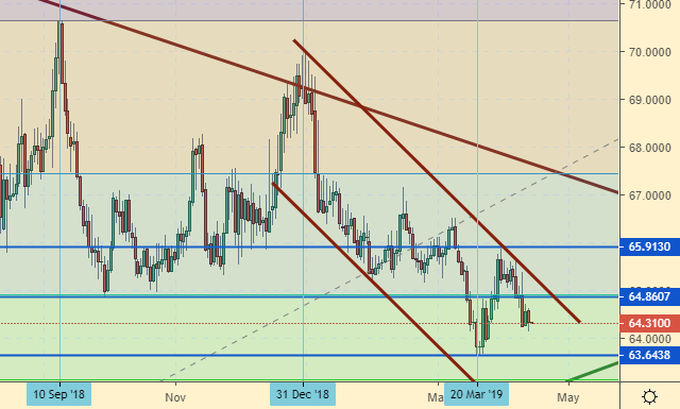 Сценарий роста: выбили наш стоп на 64.30 и встали. Нет ничего обиднее. Снова купим и после роста выше 65.00, и прямо здесь, стоп на 64.04. Рассуждения ЦБ о возможности снижения ставки должны вернуть рубль выше 65.00.