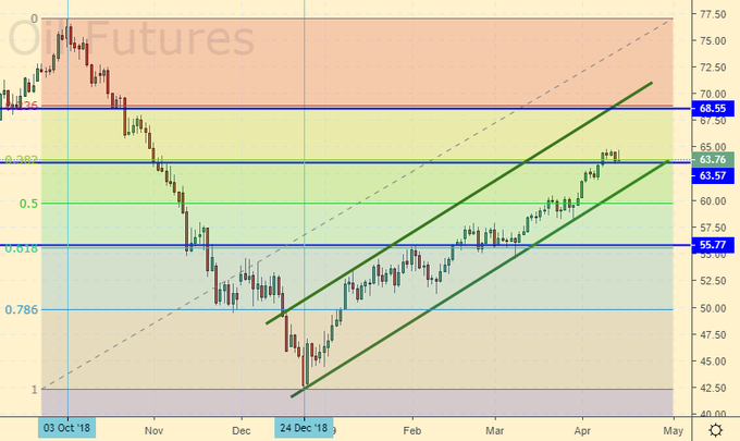 Сценарий роста: рассматриваем майский фьючерс, дата экспирации 22 апреля. Идем на 68.50. Вплоть до 63.00 можно покупать. Если уйдем ниже 63.00 выйдем из растущего канала. Быки не должны допускать подобного.
