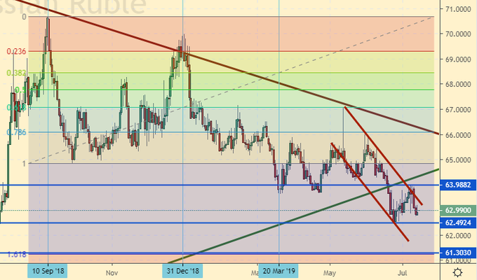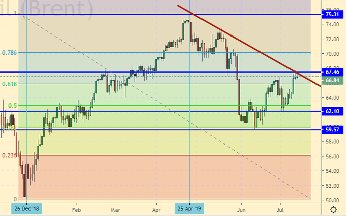 Сценарий роста: рассматриваем сентябрьский фьючерс, дата экспирации 31 июля. Если вы вошли в покупку при росте выше 66.00 – стоять. Но, как видим, неделя закончилась без явного перевеса быков, хотя ценовой рывок среди и выглядит неплохо. Для подтверждения роста надо расти выше 68.00, если это произойдет можно нарастить лонги.
