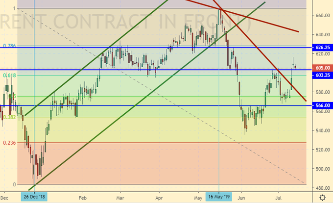 Сценарий роста: рассматриваем августовский фьючерс, дата экспирации 12 августа. Весело дернули вверх. Пока будем стоять. В районе 626.0 встретим сопротивление. Если его возьмем, то далее ждет нас 640.00, далее 670.0.