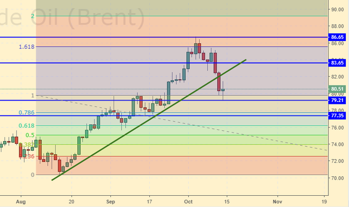 Сценарий роста: рассматриваем декабрьский фьючерс, дата экспирации 31 октября. То, что рынок смог пройти ниже 79.90 в пятницу – это плохо. Шансы на рост остаются, но темп будет ниже. А в случае, если какой-либо из дней закроется ниже 79.00, мы продолжим падение, для начала к 77.35, а затем и ниже.  Если и покупать, то на «часовках» и осторожно. Глобальных покупок рекомендовать не будем.