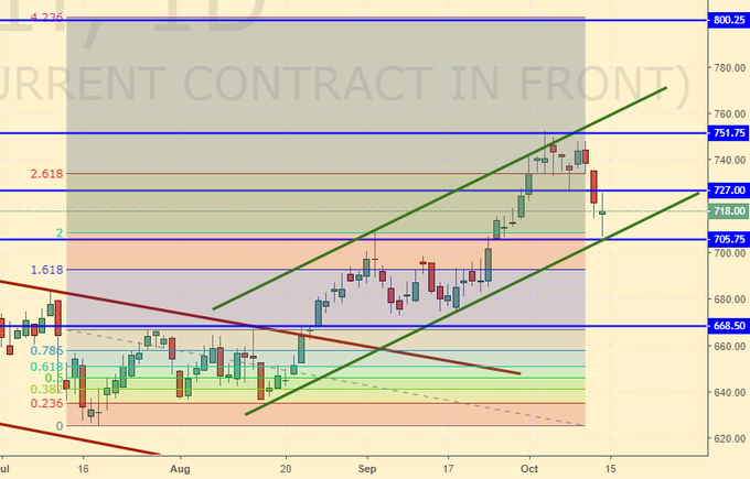 Сценарий роста: рассматриваем ноябрьский фьючерс, дата экспирации 12 ноября. Учитывая то, как развиваются дела на рынке нефти, мы не можем рекомендовать покупки с текущих уровней, как бы это не выглядело соблазнительно с точки зрения техники, так как мы находимся у нижней границы восходящего канала.