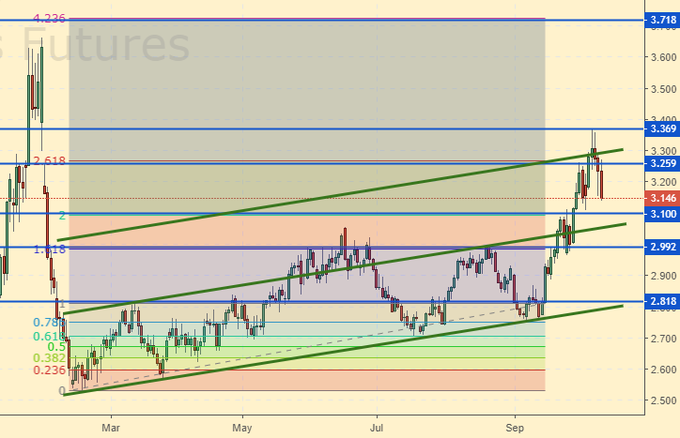 Сценарий роста: рассматриваем ноябрьский фьючерс с датой экспирации 29 октября. Здесь надо дать высказаться всем желающим. А они, как видим, есть. Можно нарастить позиции на покупку. Все эти красные длинные пятничные свечи на фоне приближающейся зимы не производят впечатления. Ниже 3.00 рынок не виден. Восхождение к 5.00 должно быть продолжено.
