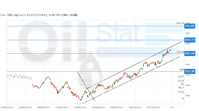 Сценарий роста: рассматриваем мартовский фьючерс, дата экспирации 12 марта.  В прошлом прогнозе мы предполагали, что проход выше 600.00 скорее всего окажется ложным и цены не закрепятся выше данного уровня. Если исходить из инженерной точности, то мы ошиблись, это так. Что делать? Можно купить со стоп-ордером на 594.00. Плотненько так попробовать, разок, не более, может и сходим на 700.00
