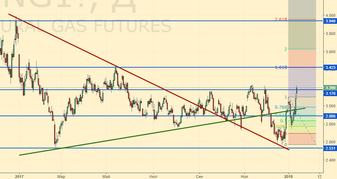 Сценарий роста: рассматриваем февральский фьючерс с датой экспирации 29 января. Так уже и хочется закричать от нервного истощения: «Ну, давай, родной, выноси!». Желательно куда-нибудь в район 10.00! Да здравствуют американские холода и вмерзшие в озера крокодилы! Газ, забодал за последний год. Покупаем.