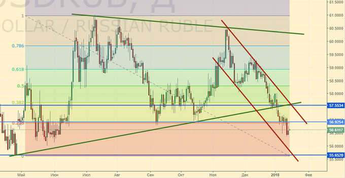 Пока мы движемся на юго-восток.  Цены закрепились под 57.00, и далее есть предпосылки хода к 55.00, о котором мы писали бесчисленное уже количество раз. К разговору о покупках мы вернемся, когда рынок будет выше 57.60. Если будет касание 55.70 – покупаем.