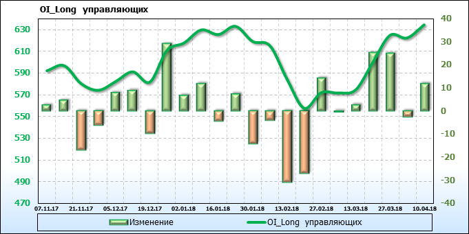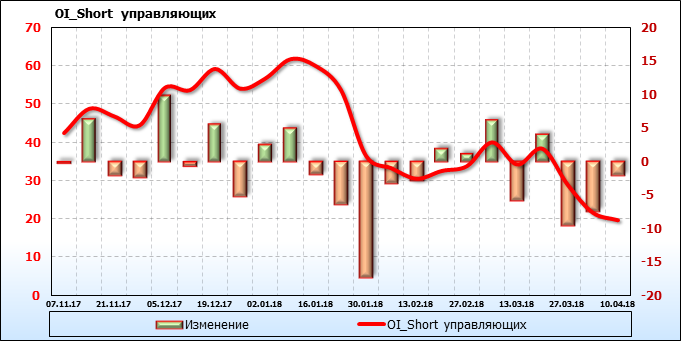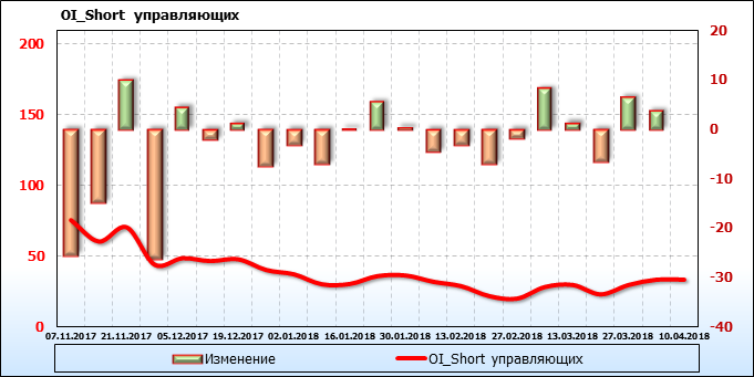 Видим рост длинных позиций управляющих и незначительное падение коротких. Понимая, что на рынке восходящий тренд продолжается, а количество коротких позиций практически не сокращается, можно предположить, что есть вероятность скорого замедления восходящей тенденции и разворота рынка вниз.