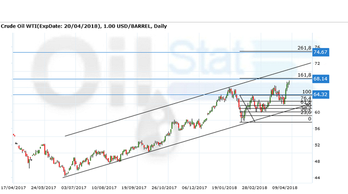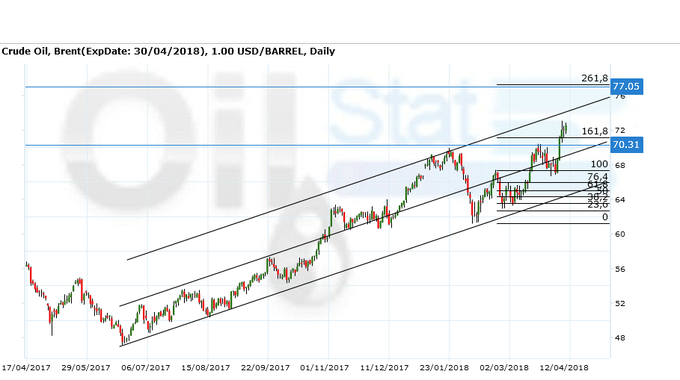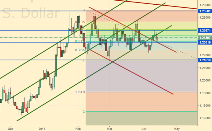 В субботу Трамп выстрелил. Куда не важно, за что, не важно. Асад виновен. Сирия лови. Вряд ли от такого поведения мир станет более предсказуемым. Если станет ясно, что далее ничего не последует, то цены на нефть могут снизиться, тем более, что мы наблюдаем продолжение роста добычи в США 10.525 (млн. баррелей в день), и рост числа буровых до 815 штук. Поэтому, как только политическая напряженность ослабнет, нефть упадет. Остается только один небольшой рывок до 77.00, а он может быть сделан на фоне случайно оброненной фразы любого крупного политика. Затем нас может ждать долгий поход вниз куда-то к 55.00.