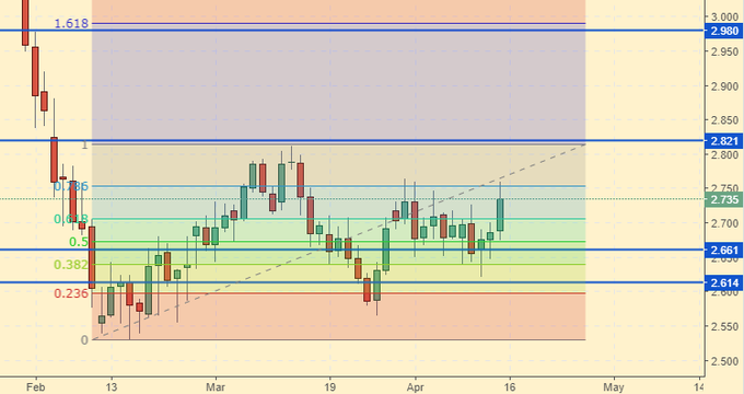 Сценарий роста: рассматриваем майский фьючерс с датой экспирации 26 апреля. Продолжаем занимать выжидательную позицию. Нужен рост выше 2.82 для того, чтобы мы вошли в покупку. Столь долгая пауза в торговле вызвана неопределенностью на самом рынке. Нужна подсказка, которую рынок рано или поздно даст нам.