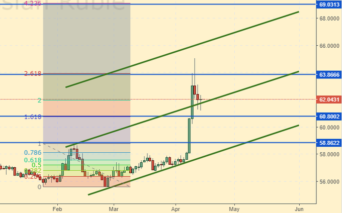 Сценарий роста: Трамп пострелял, никого не убил, всем стало легче. Однако, если наши парламентарии, путем введения ответных санкций, начнут лишать страну притока валюты, а своих избирателей будут лишать рабочих мест, запрещая экспорт и сокращая доходы, то ход к 70.00 продолжится. Откат к 60.80 возможен, но не очевиден, если он будет, купить обязательно. Можно покупать сейчас, постепенно наращивая агрессию по мере укрепления рубля, вплоть до 60.00.