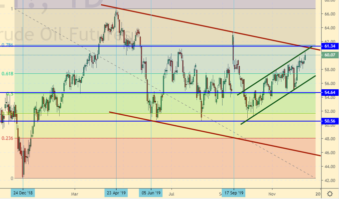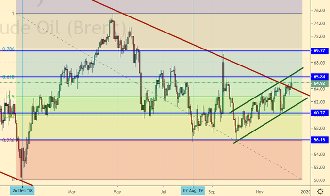 Растем очень тяжело. Несмотря на перспективы снижения (стабилизации) добычи нефти в США, рынок не видит причин для сильного роста. Результат по добыче на уровне 12.8 млн. баррелей в сутки можно расценивать как хороший, но он ниже заявленных ранее ожиданий. Как минимум американцы недоберут 1 млн. тонн в сутки к концу года по сравнению с прогнозами. В ситуации снижения активности в применении технологии ГРП рассчитывать на 14.0, не то, что на 15.0 в 2020-м году нам не приходится. И это, так или иначе, поддерживает рынок.