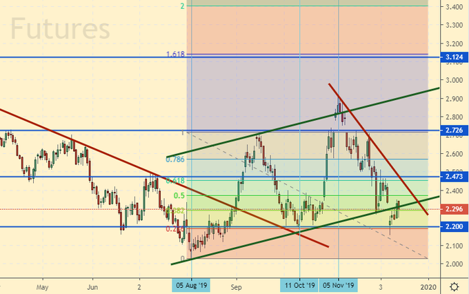 Сценарий роста: рассматриваем январский фьючерс с датой экспирации 27 декабря. По мере торможения добычи с помощью ГРП в США, уменьшится предложение природного газа и цены на него поднимутся. Обозначили поддержку на 2.200. Можно купить.