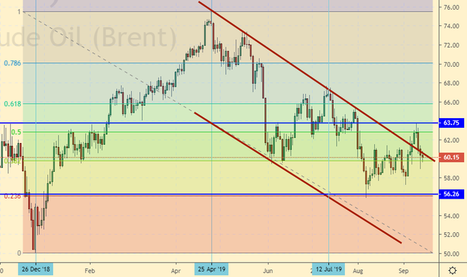Сценарий роста: рассматриваем ноябрьский фьючерс, дата экспирации 30 сентября. Некрасиво. Вышли выше 62.00, потом отправились думать вниз, хотя и не глубоко. Пока мы выше 58.00 можно покупать.