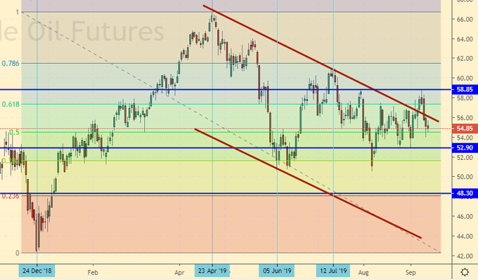 Группа лиц купилась на пробой линии сопротивления в районе 57.00 и вошла в лонг. Может быть им и повезет. Но неделя закрылась в красной зоне, даже новости о неприятностях у саудовцев с их перерабатывающим заводом от атак дронов в понедельник могут не помочь. Ситуация такова, что после падения ниже 54.00 все быки с рынка убегут.