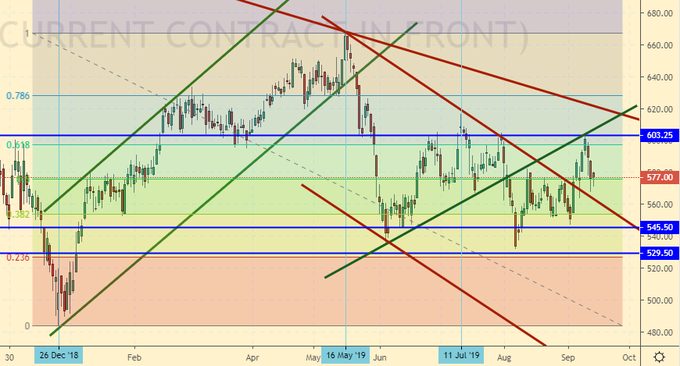 Сценарий роста: рассматриваем октябрьский фьючерс, дата экспирации 10 октября. Тени вниз. Быки стараются удержать ситуацию. Пока мы выше 560.0 – это лонг.