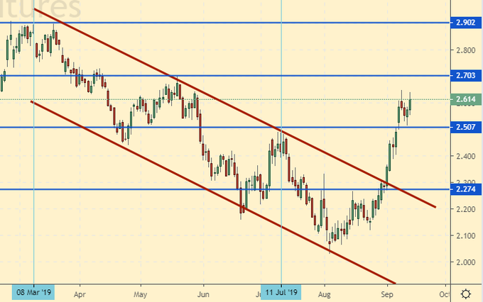 Сценарий роста: рассматриваем октябрьский фьючерс с датой экспирации 26 сентября. Жаль, отката к 2.35 мы так и не увидели. Все возбужденные. Встречают осень и зиму. График наполнения хранилищ соблюдается. Заметим, что чем выше цены, тем более конкурентноспособным будет американский газ в Европе. На Западе народ привык обходиться малой маржой. За счет этого могут проводить экспансию.