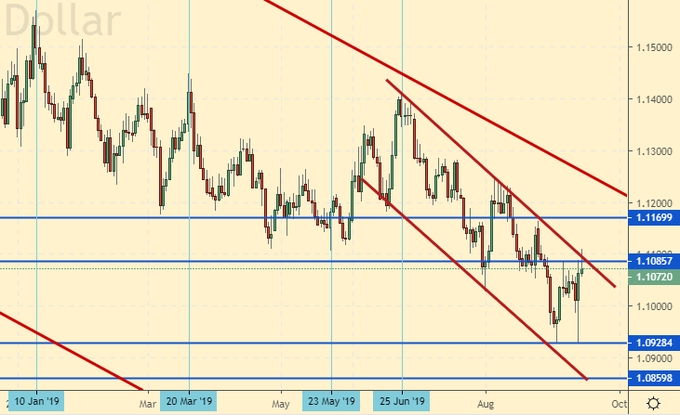 Сценарий роста: ЕЦБ признался во всех грехах, раскаялся, оставил ставку на нуле, ставку по депозитам снизил на 0,1% до -0,5% и объявил о программе количественного смягчения. Большого восторга быков от сего решения мы не видим. Акцент сместился на заседание ФРС США 18-го числа. Американцы ставку вряд ли изменят, но и сохранение статус кво, дает доллару преимущество (разница в ставках на стороне зеленой бумаги). Поэтому, рост евро если и увидим в эти дни, то пока до 1.1200. Если же к концу года доллар дрогнет, вот тогда можем взять курс на 1.3800.
