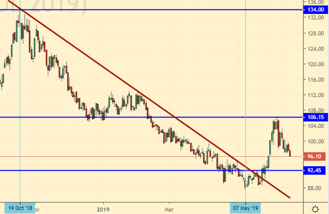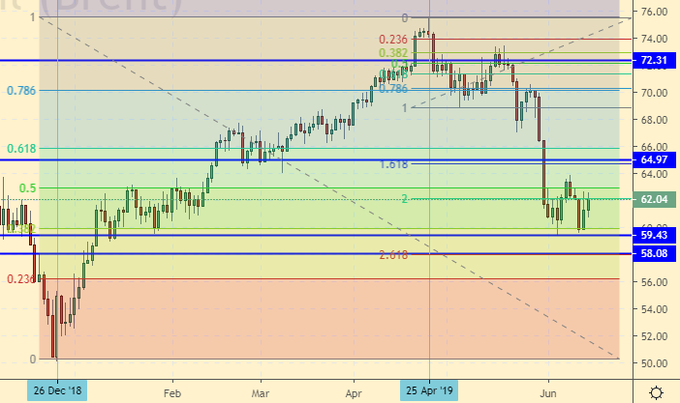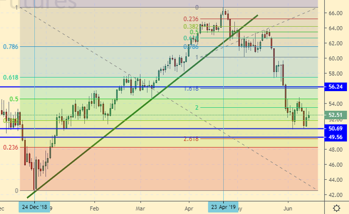 Несмотря на все проблемы роста мировой экономики, связанные с торговыми войнами, представители ОПЕК не думают пока сокращать собственный прогноз по объемам потребления нефти к концу 2019 г, продолжая утверждать, что спрос на нефть вырастет в 3-м и 4-м кварталах на 1.5 млн. баррелей в сутки. Опасность здесь кроется в том, что факт может быть ниже прогноза. В этом случае, никому не нужные 15 млн. баррелей нефти в день надо будет где-то складировать. Можем легко получить ситуацию конца 15 года, когда под хранилища начинали использовать и танкеры. Если же на этом фоне ситуация с Венесуэлой и Ираном разрешиться в лучшую сторону, то фундаментального давления на рынок не избежать.