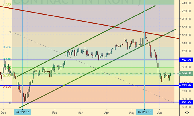 Сценарий роста: рассматриваем июльский фьючерс, дата экспирации 11 июля. Если пробьемся выше 565.0, отправимся на 590.0. Что нам и нужно, если опираться на лонг, открытый в начале недели.