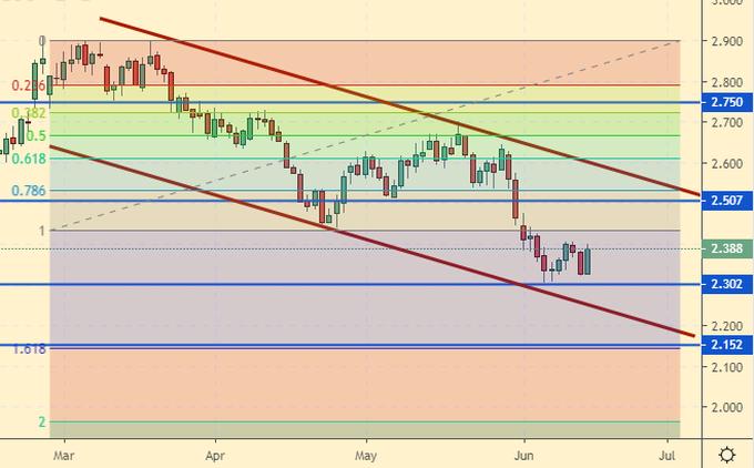 Сценарий роста: рассматриваем июльский фьючерс с датой экспирации 26 июня. Временно нашли себя на 2.30. Медведи продолжают контролировать ситуацию. Пятничный рост может перерасти в движение к 2.50, но возможность подняться выше вряд ли будет. Напомним, что себестоимость добычи газа в некоторых регионах США отрицательная. То есть это побочный продукт добычи нефти, который попросту сжигается.