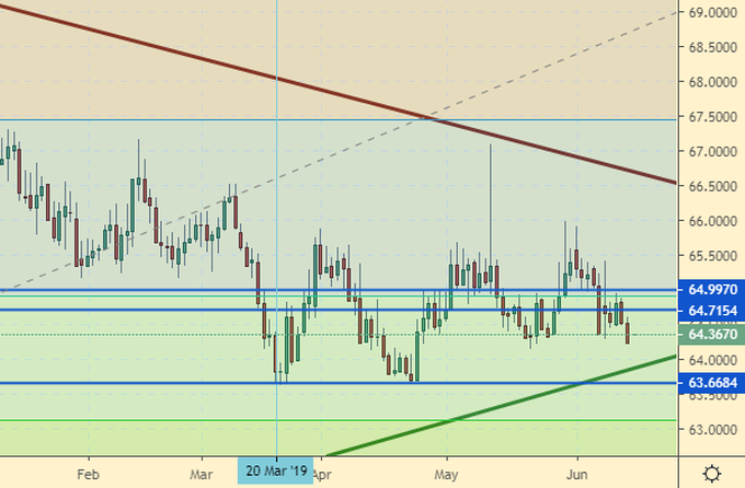 Сценарий роста: бычий рынок низвергнут. Если пройдем ниже 63.60, то он просто перестанет существовать. О покупках не помышляем. Посмотрим, что скажет ФРС США 19-го числа. Из-за отсутствия роста инфляции в Америке ждать роста ставки не приходится.