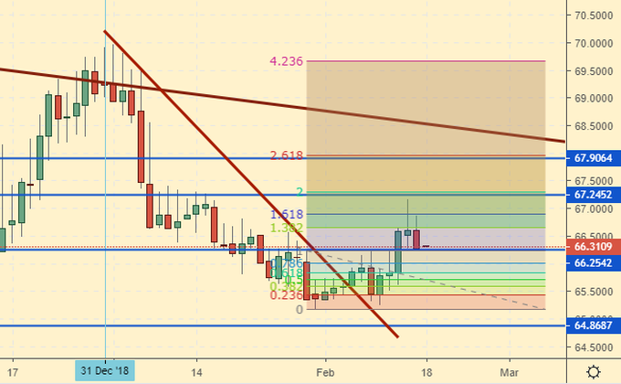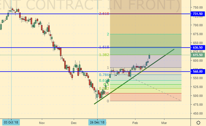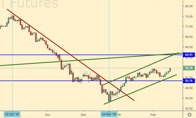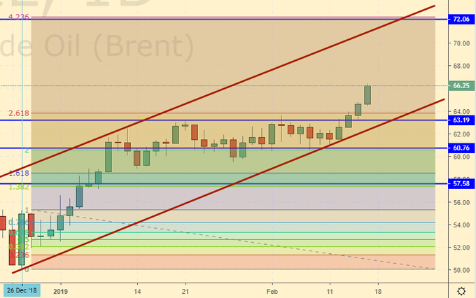Саудовская Аравия пообещала снижение добычи в марте на 700 тыс. баррелей.  Американцы ведут переговоры с китайцами, есть надежда, что торговля не замрет и оптимизм вернется на рынки на некоторое время. Мадуро продолжает сохранять власть, а значит Венесуэла пока далека от экономического роста и роста добычи. Иран проявляет стойкость, но добыча и предложение на внешнем рынке падают. Европейские политики пытаются с ним работать, дабы сохранить собственное лицо, так как они были против антииранских санкций, но крупный нефтяной бизнес ушел из страны. Санкции США не позволяют покупать иранскую нефть. На таком фоне черное золото прошло вверх 63.00 (Brent) и отправилось к 72.00.