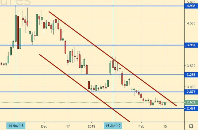 Сценарий роста: рассматриваем мартовский фьючерс с датой экспирации 26 февраля. Учитывая рост стоимости нефти и её производных можно сделать ставку на то, что и газ начнет дорожать. Риск здесь приемлем. Можно купить опираясь на свечку пятницы.
