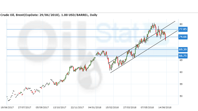 Сценарий падения: разговоры о возможном росте добычи со стороны Саудовской Аравии и России не могут быть позитивными для цены. На самом деле, хватает и того, что США продолжают закрывать все больше своих потребностей за счет собственной добычи. Закончится летний сезон и куда все это топливо собираются девать? Наверное, в Кушинг. А пока, мы ждем прилета цен в район 70.00.