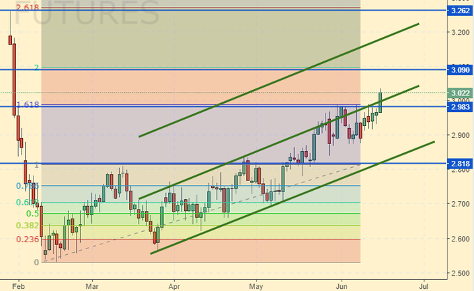 Сценарий роста: рассматриваем июльский фьючерс с датой экспирации 27 июня. Надо же! Рост. Мы пробили 3.00 и даже смогли закончить торговый день выше этой знаковой отметки. Что ж, терпение быков оказалось вознаграждено. Теперь мы можем рассчитывать на рост до 3.26.