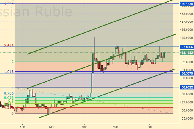 Рубль отметился нервным рывком вверх в пятницу вслед за падающей нефтью и вернулся к 63.00. ЦБ РФ в пятницу ставку не повысил, но возможно этого и не стоило делать, так как макроэкономическая ситуация, как может казаться, не так и плоха. Ждем результаты второго квартала, когда станет понятно, что с промышленным производством, строительством и торговлей. ЧМ по футболу может немного помочь, так как все-таки 1,5 миллиона иностранных туристов потратят за месяц пусть 3000 долларов с носа, итого, 4 500 000 000 долларов, что для экономики размером с 1,2 триллиона не слишком.