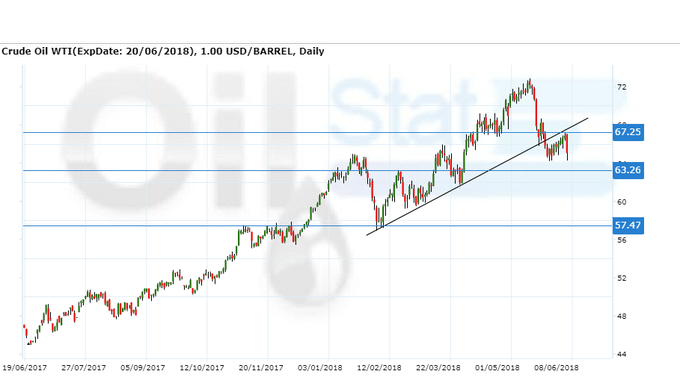 Сценарий роста: рассматриваем июльский фьючерс, дата экспирации 20 июня. Все очень красиво. Пробой линии поддержки, её тестирование с обратной стороны и продолжение падения. Покупателям здесь не место. В случае пробоя 63.20 мы отправимся на 57.50.