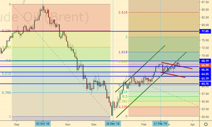 Котировки пытаются пробиться выше 68.00 по Brent. Пока это плохо получается, но активность видна. Дальше у нас район 72.00, но вот пройти выше будет уже непросто. Да и 68.00 сама по себе весьма крепкая область сопротивления.