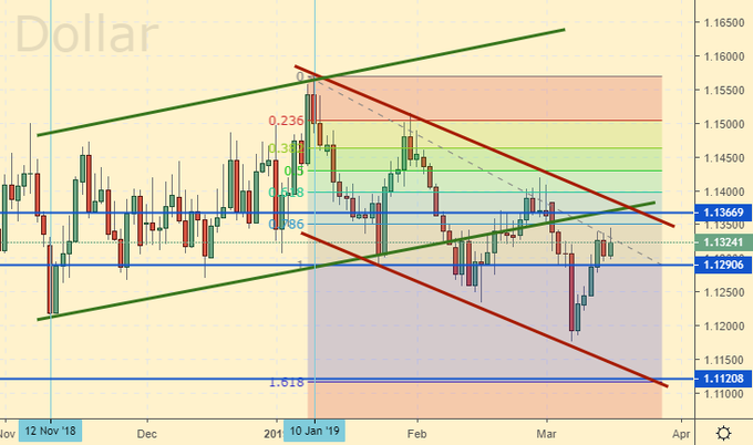 Сценарий роста: рынку будет тяжело пройти выше 1.1360. У нас заседание ФРС 20 марта (среда). Да. ФРС оставит ставку на текущем уровне. Но она не ноль, в отличии от евро. Доллар вряд ли будет падать. Кроме того в США и экономика на ходу. Текущий отскок, пока мы не понялись выше 1.1360, воспринимаем как часть большой игры против евро.