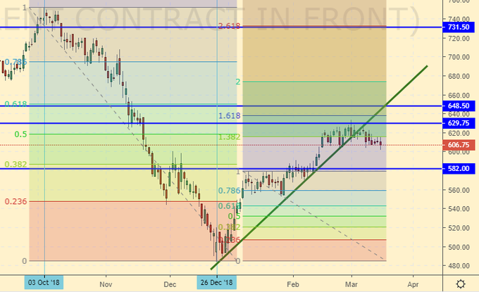 Сценарий роста: рассматриваем апрельский фьючерс, дата экспирации 11 апреля. В отличии от рынка нефти, рынок топлива не рос. Более того, медведи нарисовали «голову – плечи», что является разворотной формацией. Фигура пока не нарисовалась полностью, надо пройти вниз 600.0, но даже то, что мы видим, это сильный медвежий сигнал. Подумаем о покупках только при подходе к 582.0.