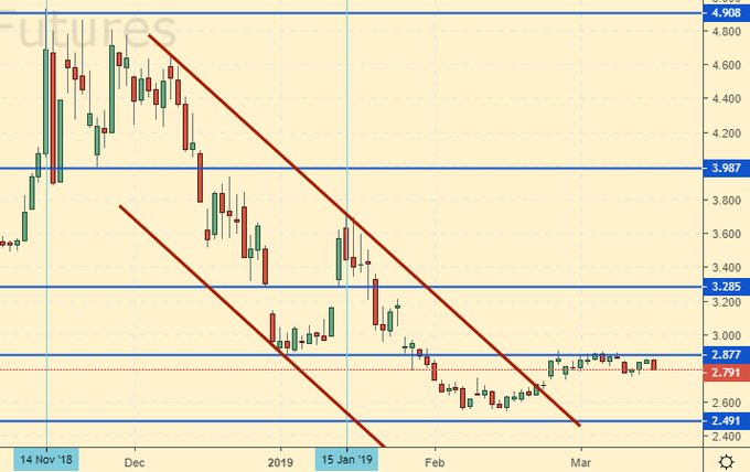 Сценарий роста: рассматриваем апрельский фьючерс с датой экспирации 27 марта. Покупатели пасуют перед трудностями и не могут пройти к 3.00. Это прямое приглашение к продавцам нарастить свои позиции. Напомним, что если хода к 3.00 не будет, то не будет и импульса, а это приглашение к спуску на 1.00.