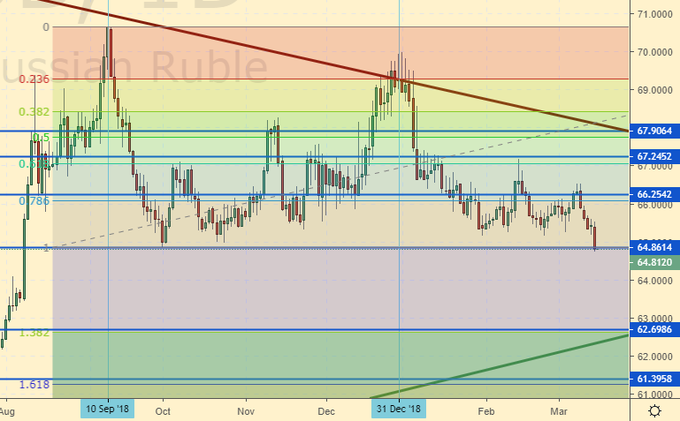 Сценарий падения: в понедельник мы вернемся к 65.15, чем можно воспользоваться для продаж, и пойдем ниже, к 62.70. Красная свечка пятницы с её новым минимумом с октября прошлого года может раззадорить аппетиты медведей. На следующей неделе ждем на рынке денег толпы.