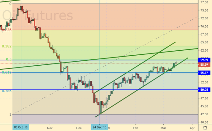 Сценарий роста: рассматриваем апрельский фьючерс, дата экспирации 20 марта. Да, это бычья тема. Смущает близость уровня 59.40, но он скорее всего падет, а вот у 62.50 будет небольшое побоище, где медведи попробуют хотя бы на время прихватить рынок. Если мы не пройдем к 62.50, это сильный плюс медведям. Тогда падение к 50.00 может быть весьма интенсивным.