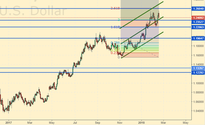 Сценарий роста: если все останется так как есть, и мы выше не пойдем, то это «неудача быков» с двойной вершиной в конце тренда. Если касания 1.2604 не будет, и вместо этого мы упадем ниже 1.2350, то движение вниз будет лишь только усиливаться день ото дня. Пока рынок выше 1.2400 можно отрабатывать идеи роста на часовках.