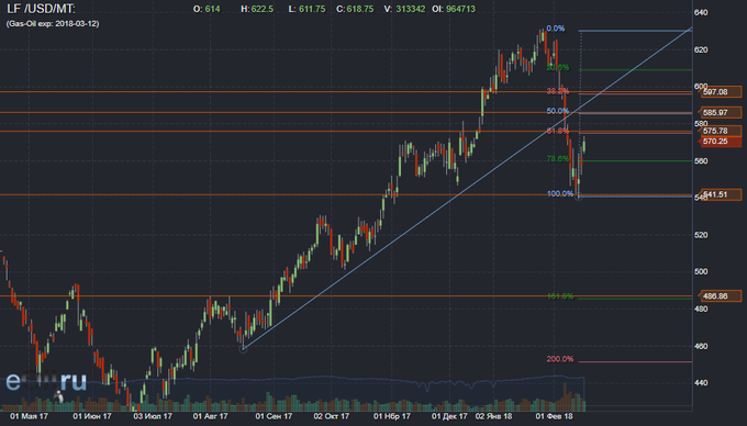 Сценарий роста: рассматриваем мартовский фьючерс, дата экспирации 12 марта. Очень слабенький отскок. Ничего хорошего в нем нет, поэтому пока не покупаем. Если рынок так или иначе на следующей неделе удержится в диапазоне и не упадет ниже 540.00, то тогда можно будет подумать о покупках.